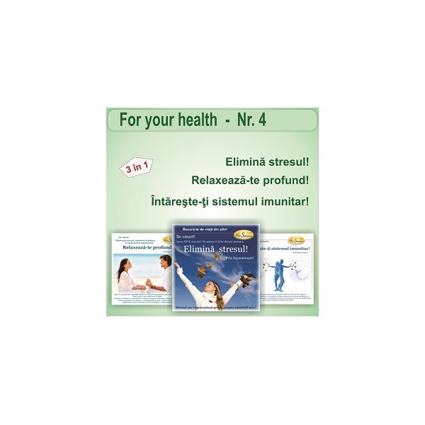 ”For your health – Nr. 4” - este o colecţie de şedinţe de hipnoterapie – în format mp3 - utile oricărei persoane interesate de starea sa de sănătate, care dorește să acționeze preventiv și să-și întărească rezistența organismului, sau care se confruntă cu perioade de scădere a rezistenței acestuia pe fond de stres sau de sensibilizare la diferiți agresori externi.